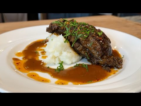Every beef braise loves a nice potato puree (use the recipe on our steak dinner" video!!). Â Place a scoop of mashed potatoes on the center of a plate. Gently place a beef cheek on top and spoon the sauce all around the cheeks and potatoes. *Optional, spoon chili oil on the cheeks and and a little on the sauce as well. Garnish with chopped fresh parsley. bon appetit!