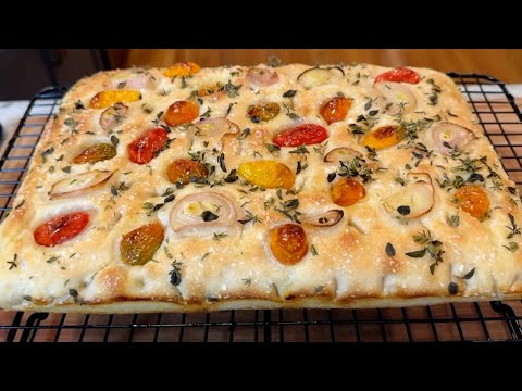 7. Preheat your oven to 400°F so that it is nice and hot and ready for you before your dough is done rising. When the dough has finished rising, top it with olive oil, dimple the dough and top it with sliced shallots, cherry tomatoes, oregano, thyme and a sprinkle of kosher salt. Place the pan in the oven for 25 to 30 minutes. Allow the bread to cool for 30 minutes before cutting into it. Enjoy!